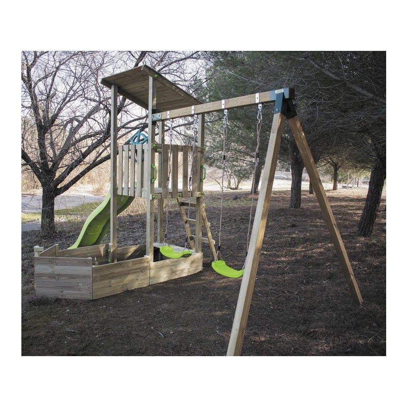 Préparez-vous pour la diversion maximale cet été et sans sortir de la maison ! Tout cela avec le nouveau Parc enfant Nautilus L avec Balançoire double de Masgames ! Profitez de cet incroyable parc, fabriqué avec le bois de la meilleure qualité et durabilité. Laissez les enfants s’amuser avec toutes les activités proposées par le Nautilus. Le nouveau bac à sable avec forme de bateau, le tobogan avec rampe ou la superbe balançoire double pour que les enfants puissent jouer accompagnés. Important: la couleur du tobogan peut varier de celle montrée sur l’image. Les accessoires extras ne sont pas inclus avec les articles. Ils sont vendus séparément. Âge recommandé : 3 ans et plus. Comprend : un parc enfant modèle Nautilus L avec maison surélevée avec toit incliné, une balançoire double avec sièges en plastique, un bac à sable en forme de bateau (sable non inclus), une échelle, un tobogan avec rampe, corners, attaches et set d’ancrages. Mesures approximatives de la tour (sans tenir compte de la balançoire) : 275 cm de haut x 110 cm de large x 275 cm de long. Hauteur approximative de la plateforme : 120 cm de haut. Matériau principal de fabrication de l’article : bois sélectionné des meilleurs sapins et pins, avec un traitement sans toxiques et arseniques, excellent pour supporter les conditions extérieures.